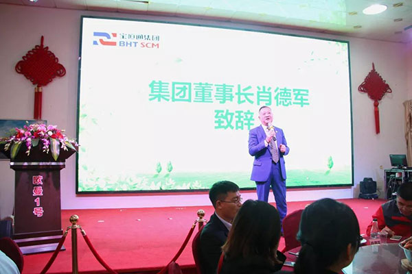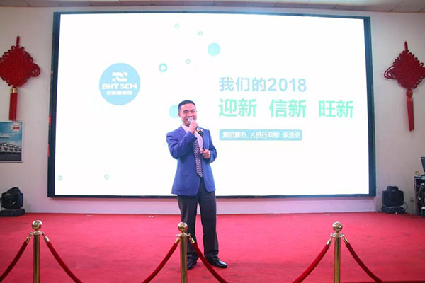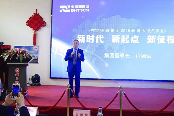 大会首先由集团董事长肖德军先生发表主题为《新时代·新起点·新征程》的重要讲话,总结回顾集团和物流与供应链板块、物流装备与汽车贸易板块、物流地产与建筑工程板块等主营业务板块过去一年以来的成绩和不足。2017年,是集团推行垂直化管理模式、优化组织架构和改革绩效管理体系、优化管理团队的创新之年,集团的经营管理迈向新的台阶。展望2018,宝恒通集团迎来了扬帆实干的第十七个年头,也是第四个五年规划的第二年。董事长肖德军详细阐述了新一年的发展战略和总体规划,对集团和各主营业务板块新一年的经营管理目标和重点工作进行部署。董事长肖德军90分钟激情洋溢的讲话,赢来了现场人员热烈的掌声。